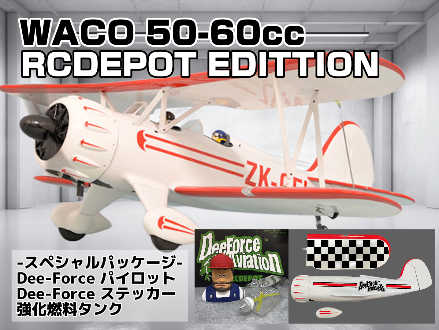 PHOENIX MODEL(フェニックスモデル)のWACO(ワコー) GP/EP 50-61ccをベースに、Dee-Forceおじさんパイロット、Dee-Forceステッカー、組み上げ済み強化燃料タンクが付属したスペシャルパッケージです。