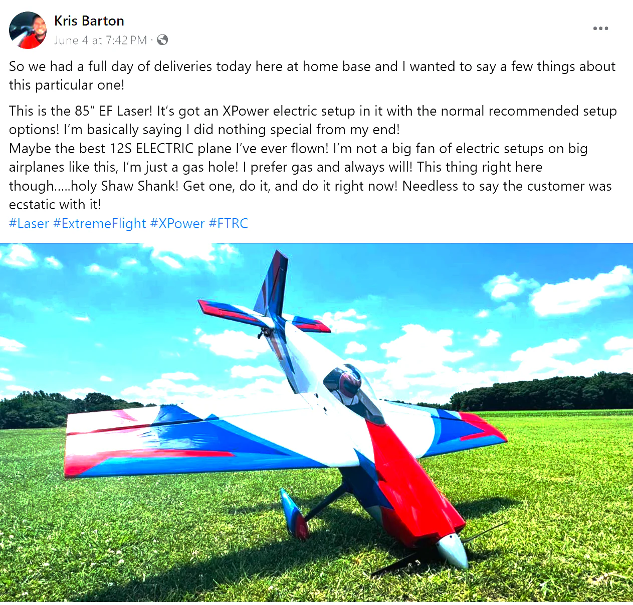 エクストリーム・フライト・レーザーの飛行性能は伝説的であり、85インチは軽快な操作感、安定性、XA性能であなたを驚かせるでしょう。レーザーはアクロバット飛行のあらゆる分野で卓越しており、アクロバット用オールラウンダーとして最適な選択です。電気式またはガソリン式動力に対応する、3D/精密/XA対応の万能機体です。見た目、性能、迅速な組み立て、軽量性、高強度——レーザーはすべてを備えています!