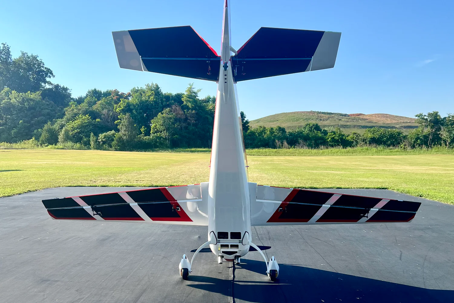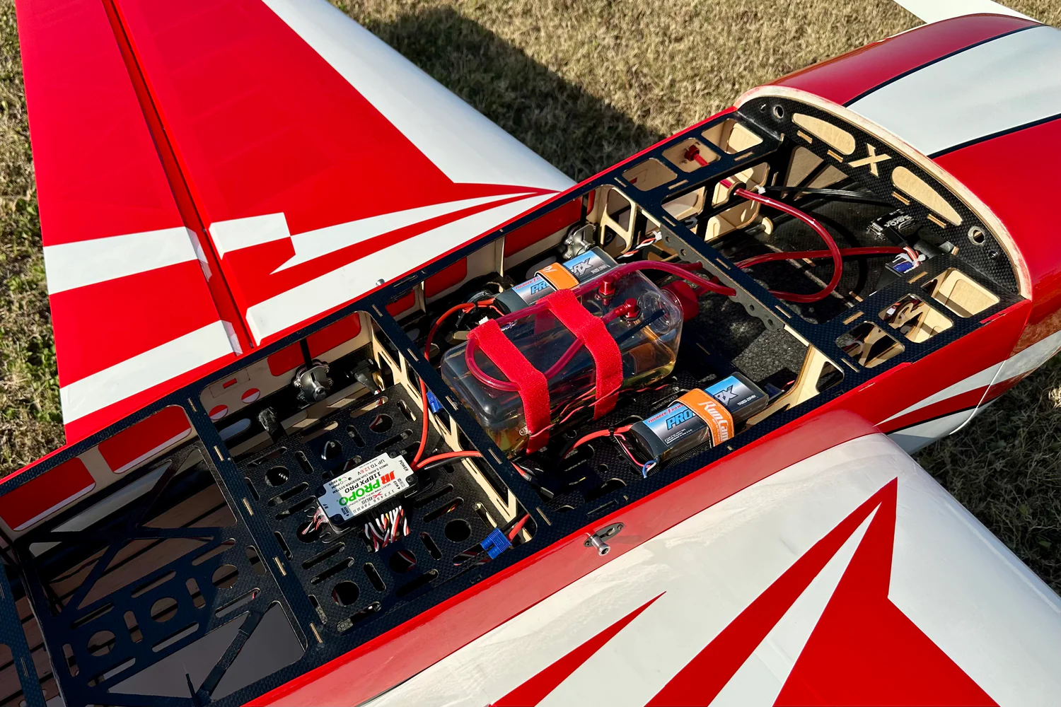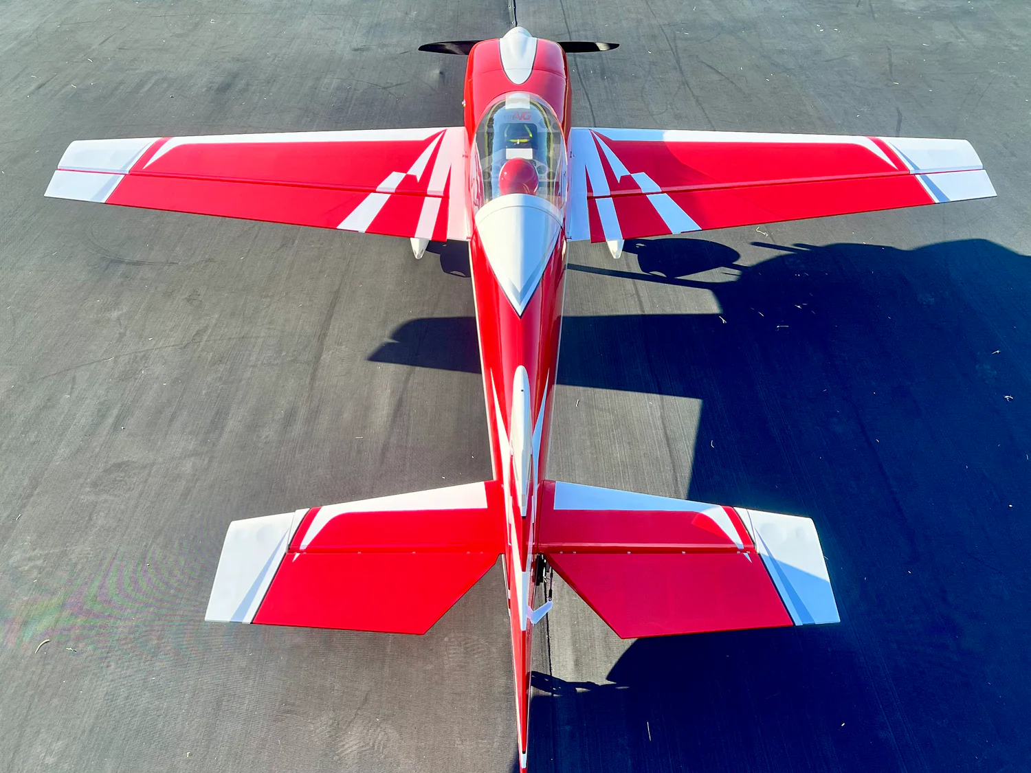 V3 Extra NGは、フルスケールNGから継承された赤/白のカラーリングに加え、新色のピンク/白と青/白の2つのUltracote/Oracoverカラーリングを採用しています。競技レベル向けのハードウェアパッケージには、事前塗装済みで取り付け済みのG10複合材コントロールホーン、チタン製ターンバックル、本物のDubroボールリンクに加え、カーボンファイバー製翼とスタビライザーチューブ、ランディングギア、テールホイールアセンブリが搭載されています。